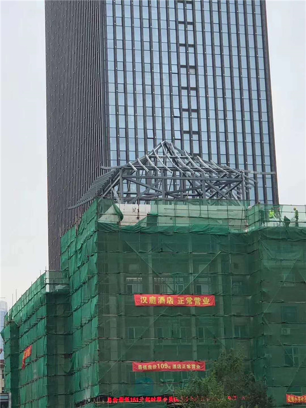 長春市人民路重點改造項目林業賓館和漢庭酒店項目屋面鋁制仿古瓦防護改造工程;采用3號分體鋁制仿古瓦,1.2mm厚;顏色:定制綠色;面積約2400平方;