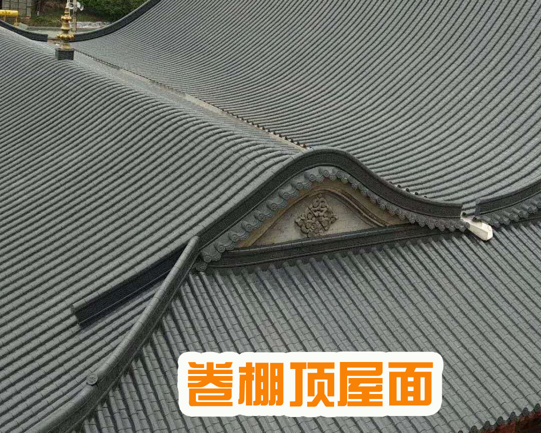 卷棚式屋頂,又稱元寶頂,是古代中國建筑的一種屋頂樣式。為雙坡屋頂,兩坡相交處不作大脊,由瓦壟直接卷過屋面成弧形的曲面,卷棚頂整體外貌與硬山、懸山一樣,唯一的區別是沒有明顯的正脊,屋面前坡與脊部呈弧形滾向后坡,頗具一種曲線所獨有的陰柔之美。根據左右山墻的懸山式和硬山式不同,卷棚頂可分為懸山卷棚、硬山卷棚、歇山式卷棚。