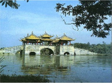 (5)揚州五亭橋 五亭橋位于我國江蘇省揚州市,瘦西湖在全國園林中獨樹一幟,五亭橋又是瘦西湖的標志。其最大的特點是陰柔陽剛的完美結合,南秀北雄的有機融和。五亭橋建于乾隆二十二年(1757年),是仿北京北海的五龍亭和十七孔橋而建的。“上建五亭、下列四翼,橋洞正側凡十有五。”鋁瓦建筑風格既有南方之秀,也有北方之雄。五亭橋上建有極富南方特色的五座風亭,挺拔秀麗的風亭就象五朵冉冉出水的蓮花。亭上有寶頂,亭內繪有天花,亭外掛著風鈴。中秋之夜,可感受到“面面清波涵月影,頭頭空洞過云橈,夜聽玉人簫”的絕妙佳境。仿古瓦做的